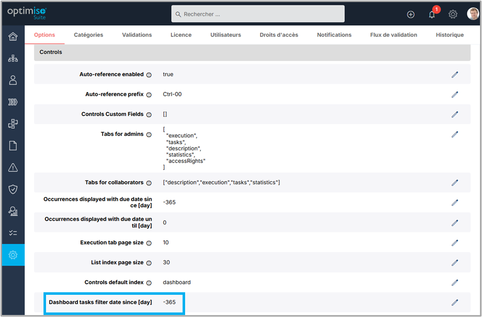 Dans la section "Dashboard tasks filter date since [day]", renseigner depuis combien de jour vous souhaitez inclure les tâches (-365 par exemple pour afficher avec toutes les tâches depuis 1 an).