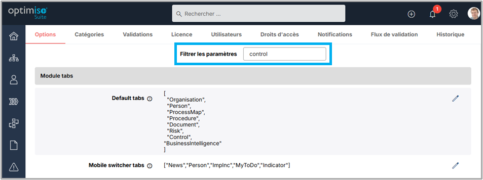 Se rendre dans les options et filtrer les paramètres du module contrôle comme mentionné ci-dessus.
